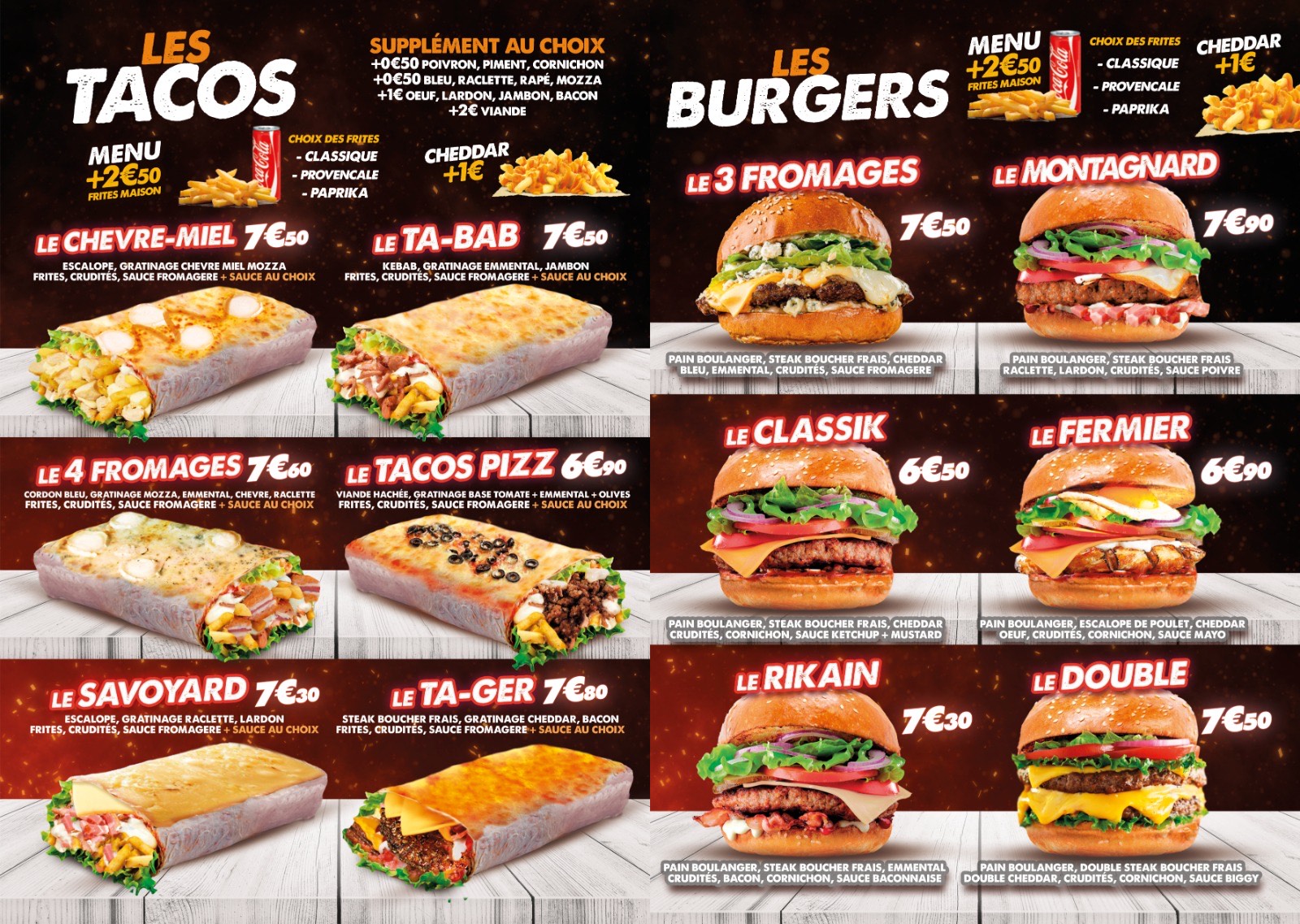 6,50 €Pain boulanger, steak boucher frais, cheddar, crudités, cornichon, sauce ketchup + Mustard
